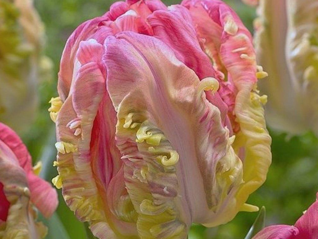 Tulipán 'Weber's Parrot' - NOVINKA v našej ponuke! Nádherný tulipán s prevažne krémovo bielymi kvetmi, ktoré sú plné zelenej a jemne ružovej farby. Má vlnité kvety a veľký kvet, ktorý je strakatý ako perie, dorastá do 40-60 cm.